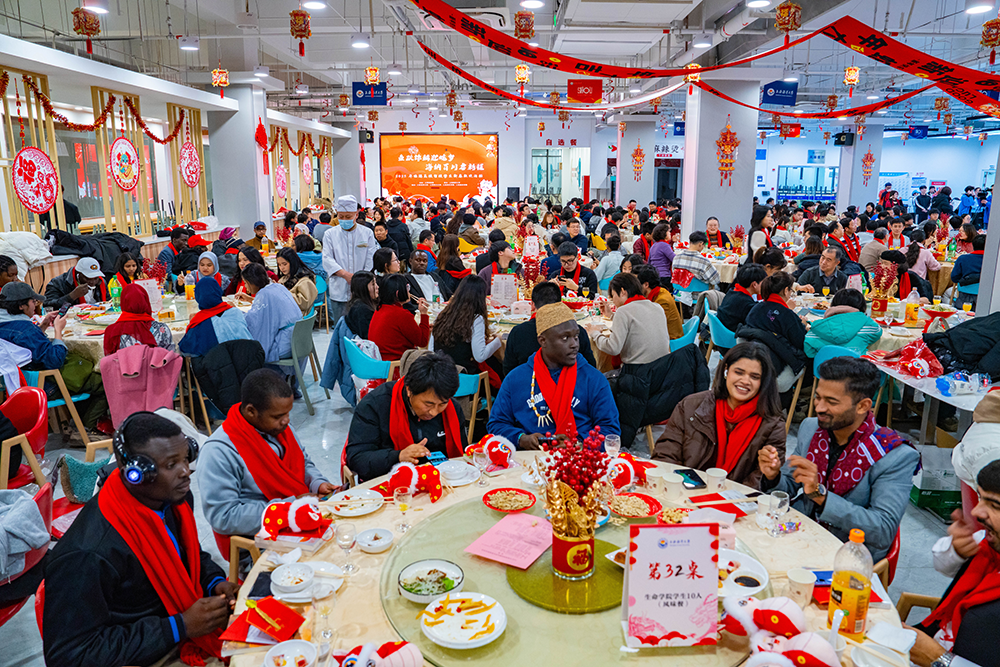 1月21日晚,在上海海洋大学第二餐厅,“鱼跃锦鳞迎蛇岁 海纳百川启新程”2025年临港高校留校学生新春联欢活动举行。本文图片均为 上海海洋大学 供图
